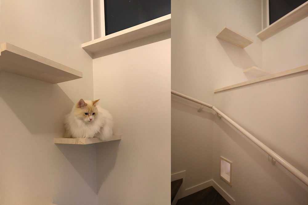 テーマは家族とねこと無理なく楽しく暮らせる家です。 陽当たり、ねこトイレ、遊び場、条件を考えプランニングしました。ねこがちゃんと居場所にいたのでうれしくなってしまいました。かわいいですね。