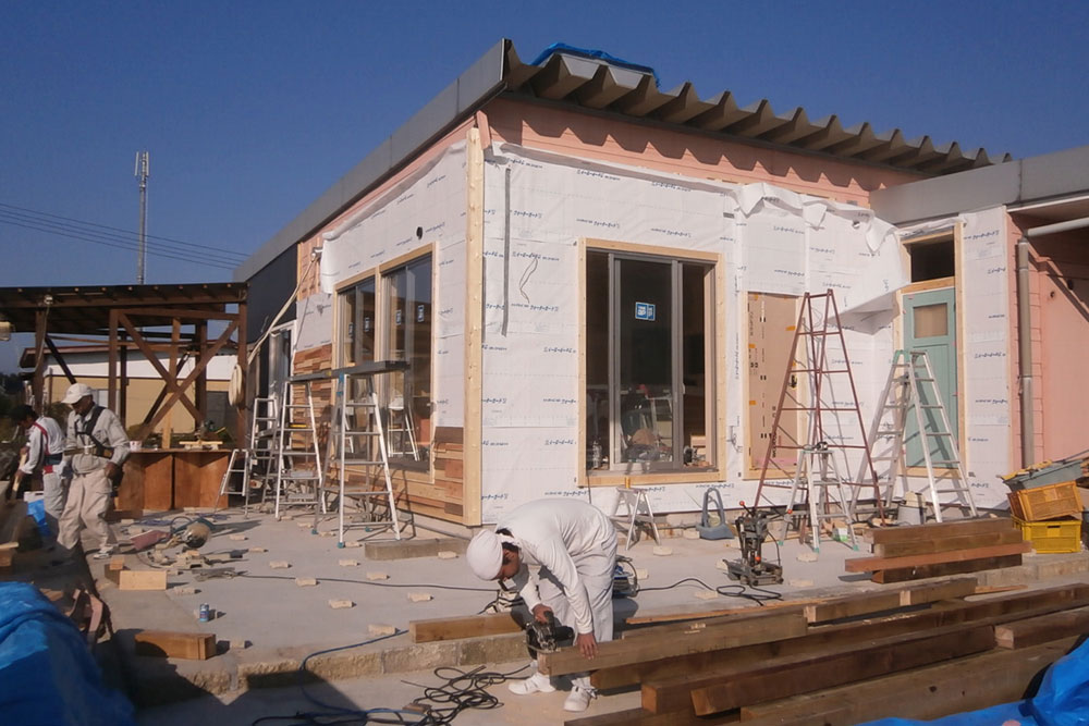 事業用物件を再構築。収益性を考慮し、今まで大きな1施設を4分割。地域のニーズに合わせ、店舗×2、住居、事務所に区分。各施設ごとリフォームさせていただきました。外部、内部は個性的に仕上げ、ボスコホーム自社職人の手仕事が生きました。家具や外壁もオリジナル。生まれ変わった物件です。
